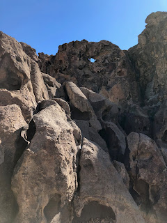 This is a trail head going into Hole-In-The-Wall, straight ahead. Below is another Pano pic. The rocks and holes I believe we made from a volcanic blast. There is a great explanation of the holes in the rocks here: https://www.desertusa.com/mnp/mnp_hole.html Plus great pictures.There is a lot of iron oxide in these rocks, thus the orange color. The volcanic rocks in Oregon were dark gray. My camera really couldn't show the depth of the rocks.